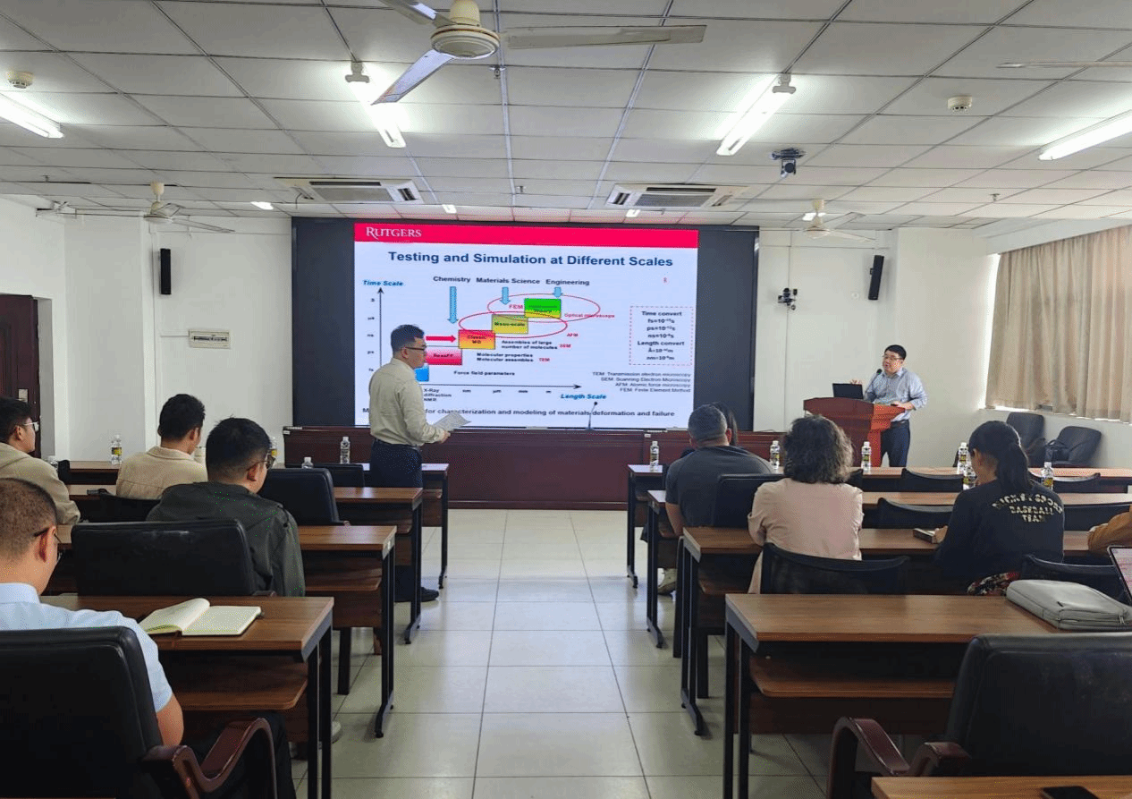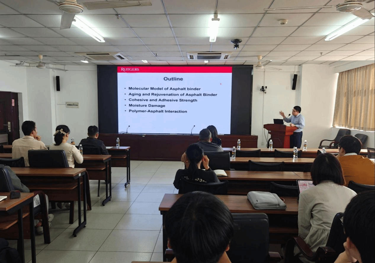 2025年12月29日上午,热带海洋土木建筑讲坛第二十讲在学校研发楼510会议室顺利举行。受土木建筑工程学院刘婉秋教授邀请,美国罗格斯新泽西州立大学土木与环境工程学院汪浩教授作了题为《沥青材料的分子模拟方法和应用》的学术报告。