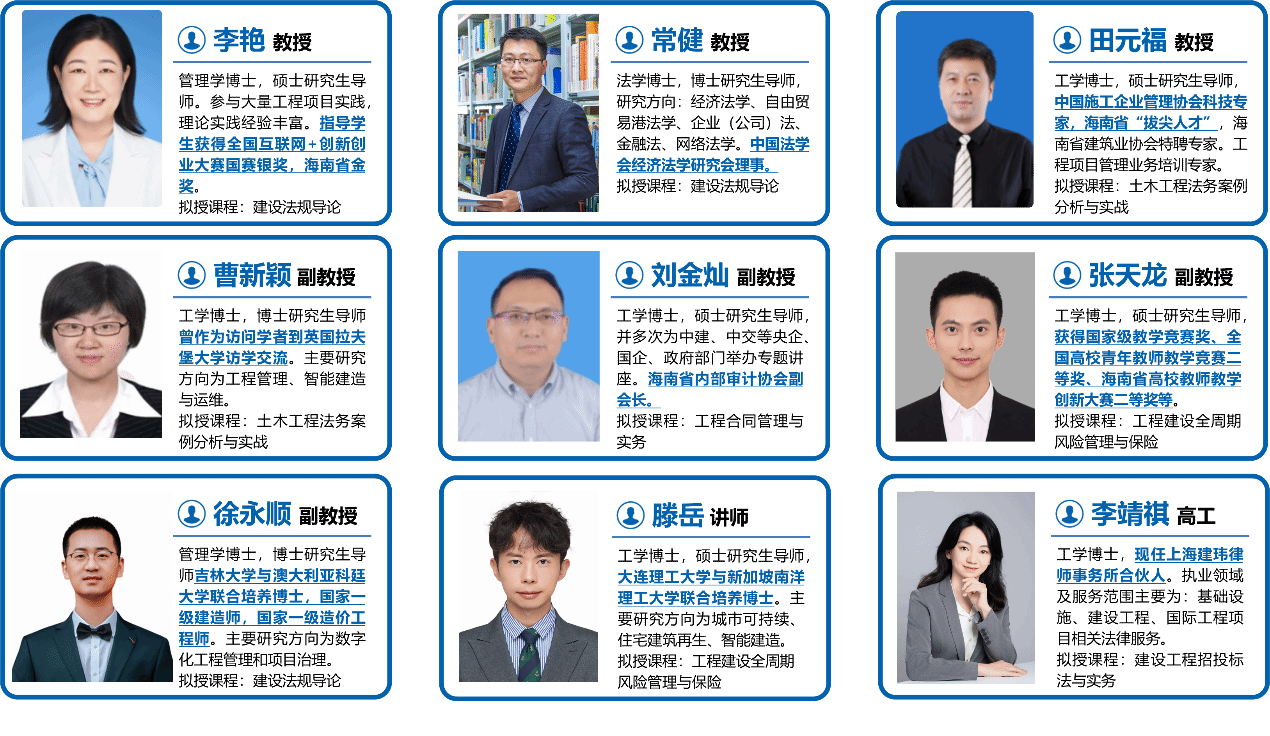 本微专业由土木建筑工程学院牵头建设,专业负责人为李艳教授。教学团队成员来自土木建筑工程学院、法学院、审计处、基建处及上海建玮律师事务所,具有工程管理、土木工程、金融法及建设工程法律等多元背景。拟授课程覆盖建设法规导论、工程合同管理与实务、工程建设全周期风险管理与保险、建设工程招投标法与实务、土木工程法务案例分析与实战等。